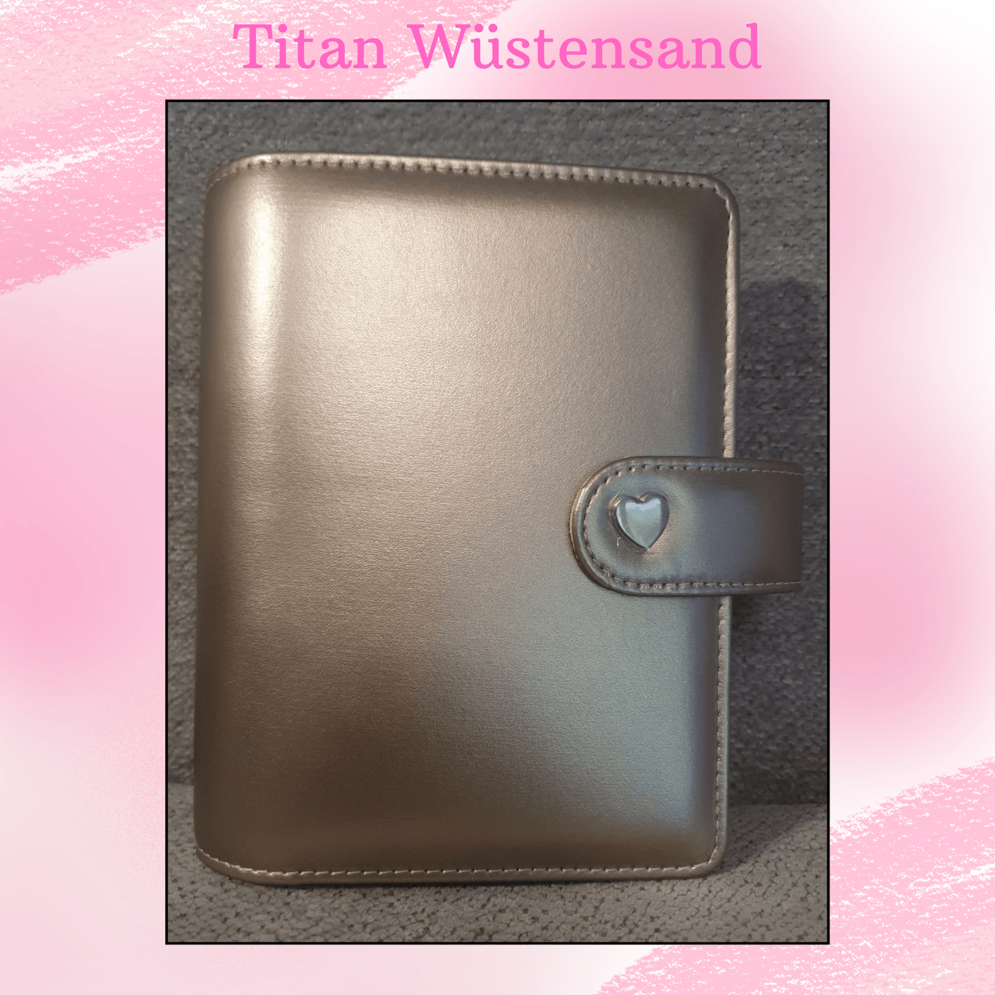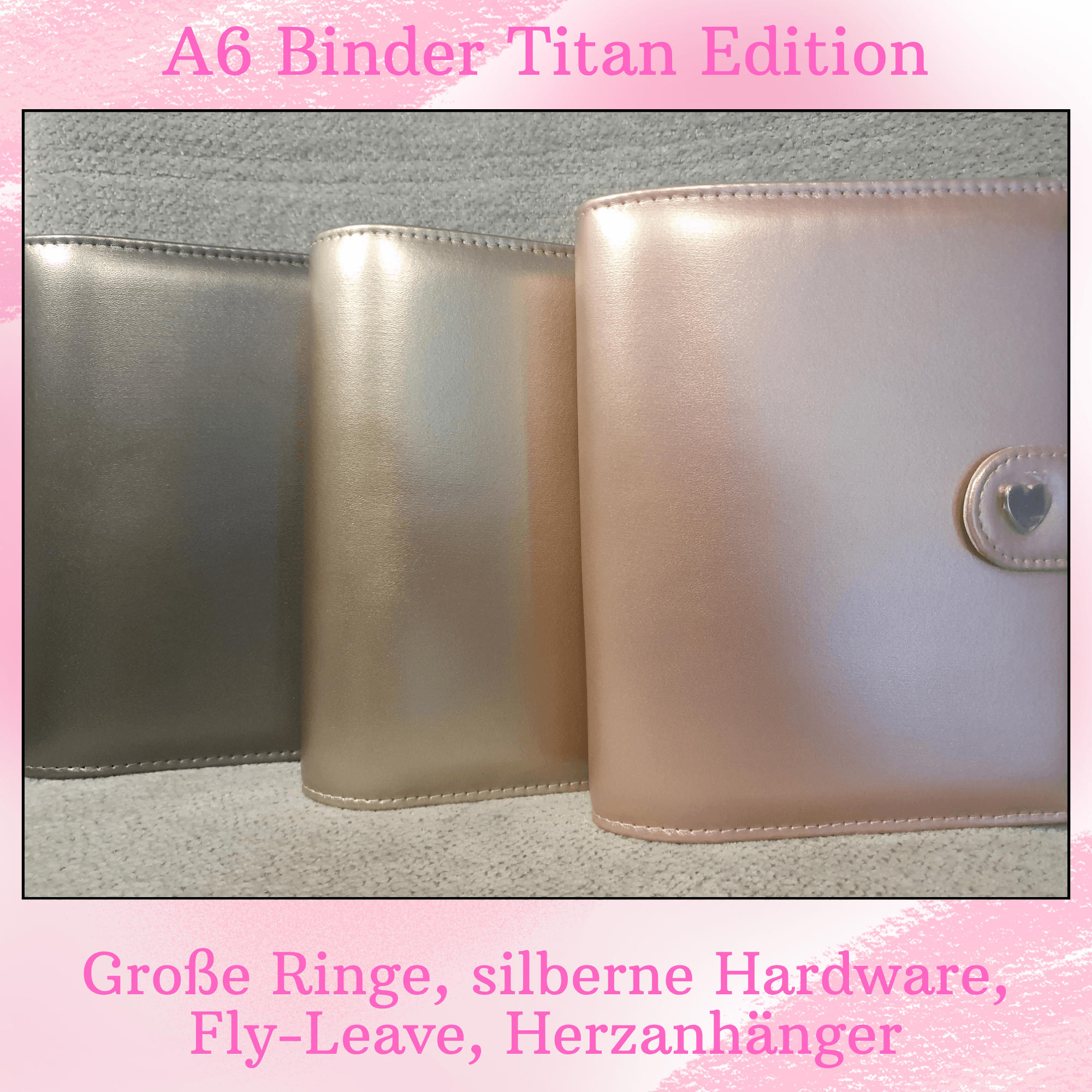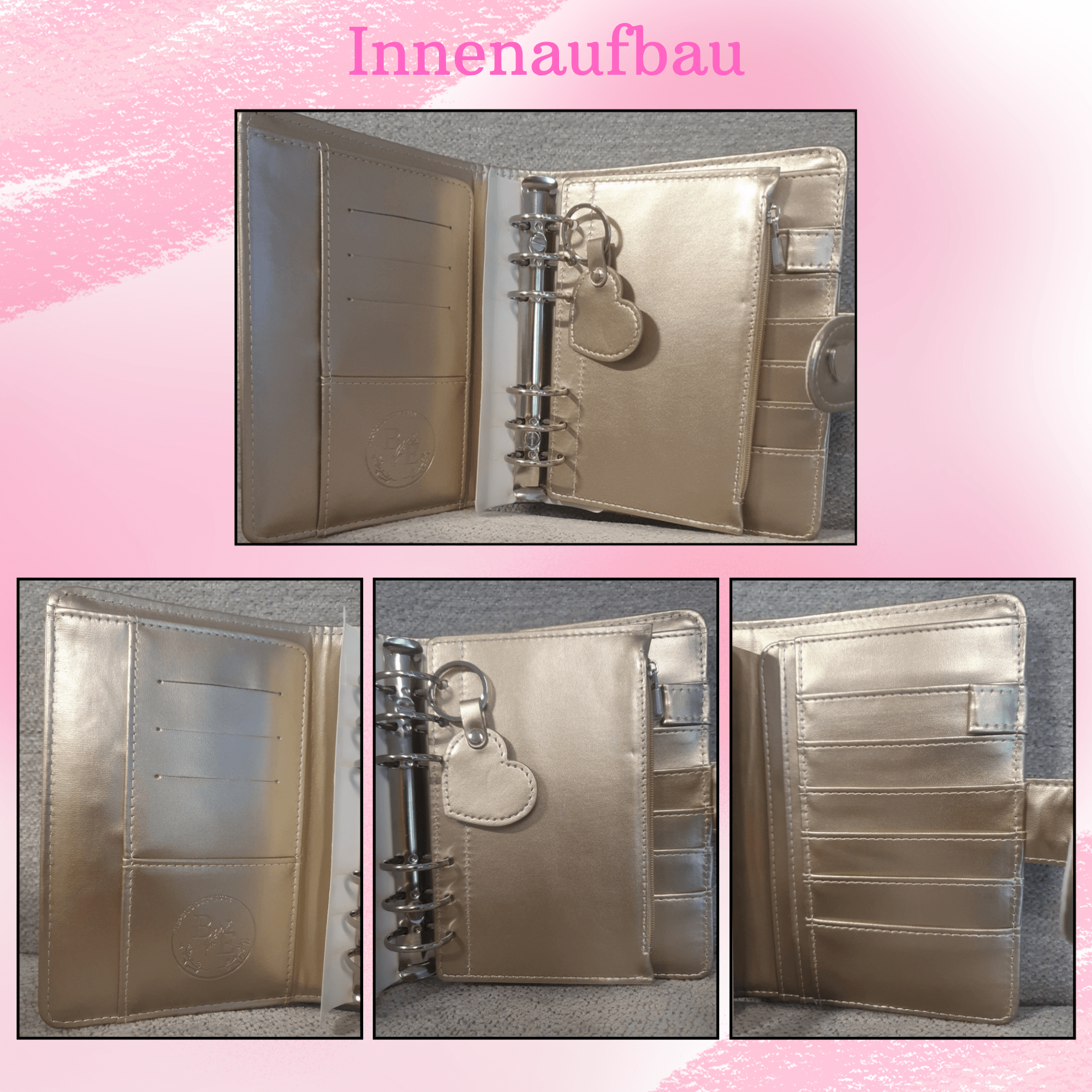 A6 Binder in verschiedenen Farben. Mit großen 3mm Ringen, Fly-Leave mit Reißverschluss an der oberen Kante und farblich passendem Herzanhänger aus glattem Leder ohne Struktur. Druckknopf mit Herz Applikation.