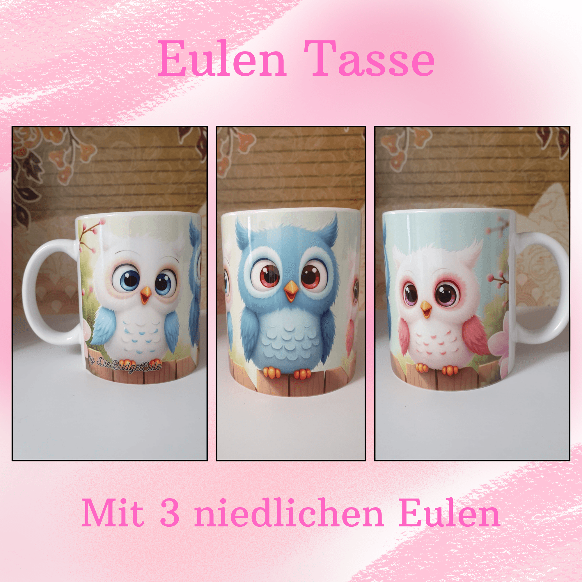 Niedliche Tasse mit drei Eulen.