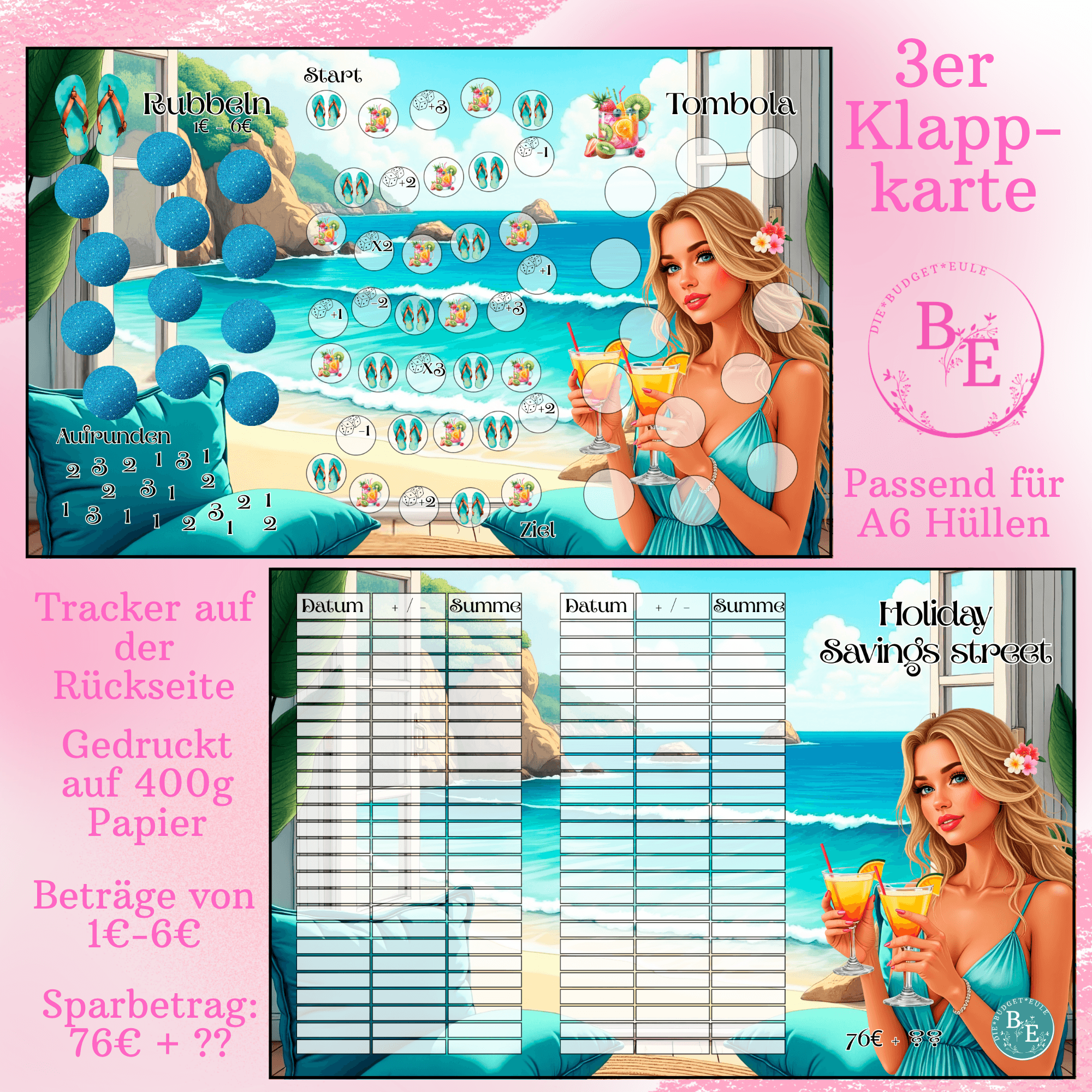 3er Klappkarte mit Sparweg zum würfeln, abstreichen, rubbeln und Losen.