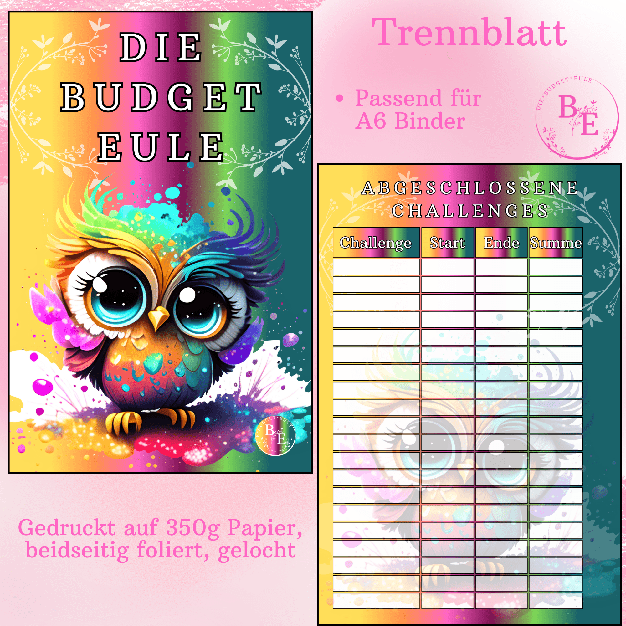 Foliertes Trennblatt zum einheften in den A6 Binder mit Tracker für abgeschlossene Challenges auf der Rückseite.